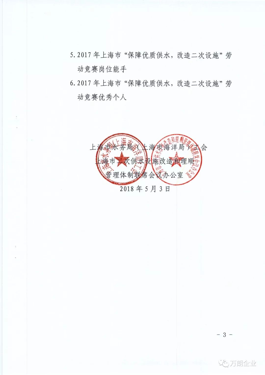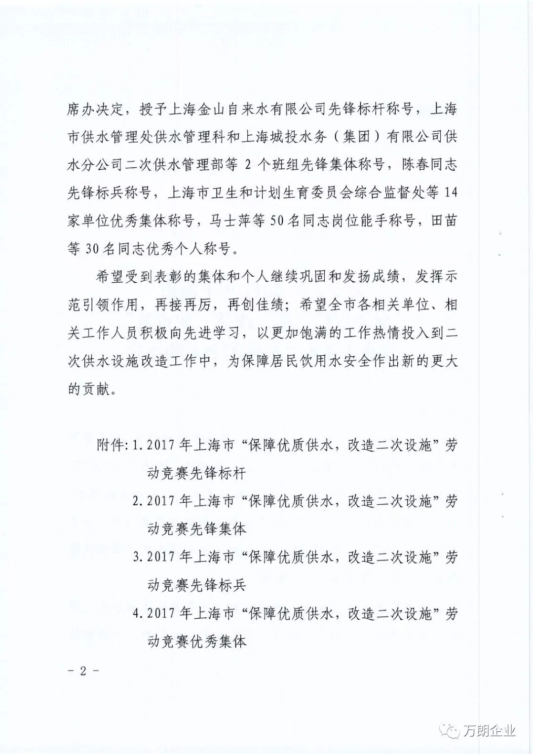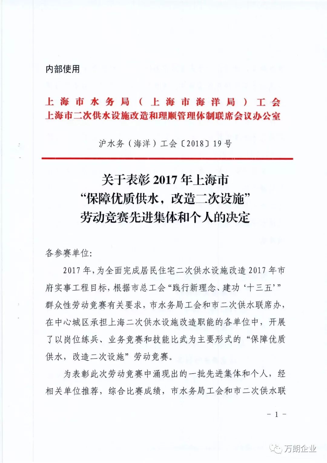 2018年5月,上海市水务局与上海市二次供水设施改造和理顺管理体制办公室对先进集体进行了表彰。上海万朗水务科技有限公司在评选中脱颕而出,荣膺“保障优质供水,改造二次设施”先进集体的光荣称号。