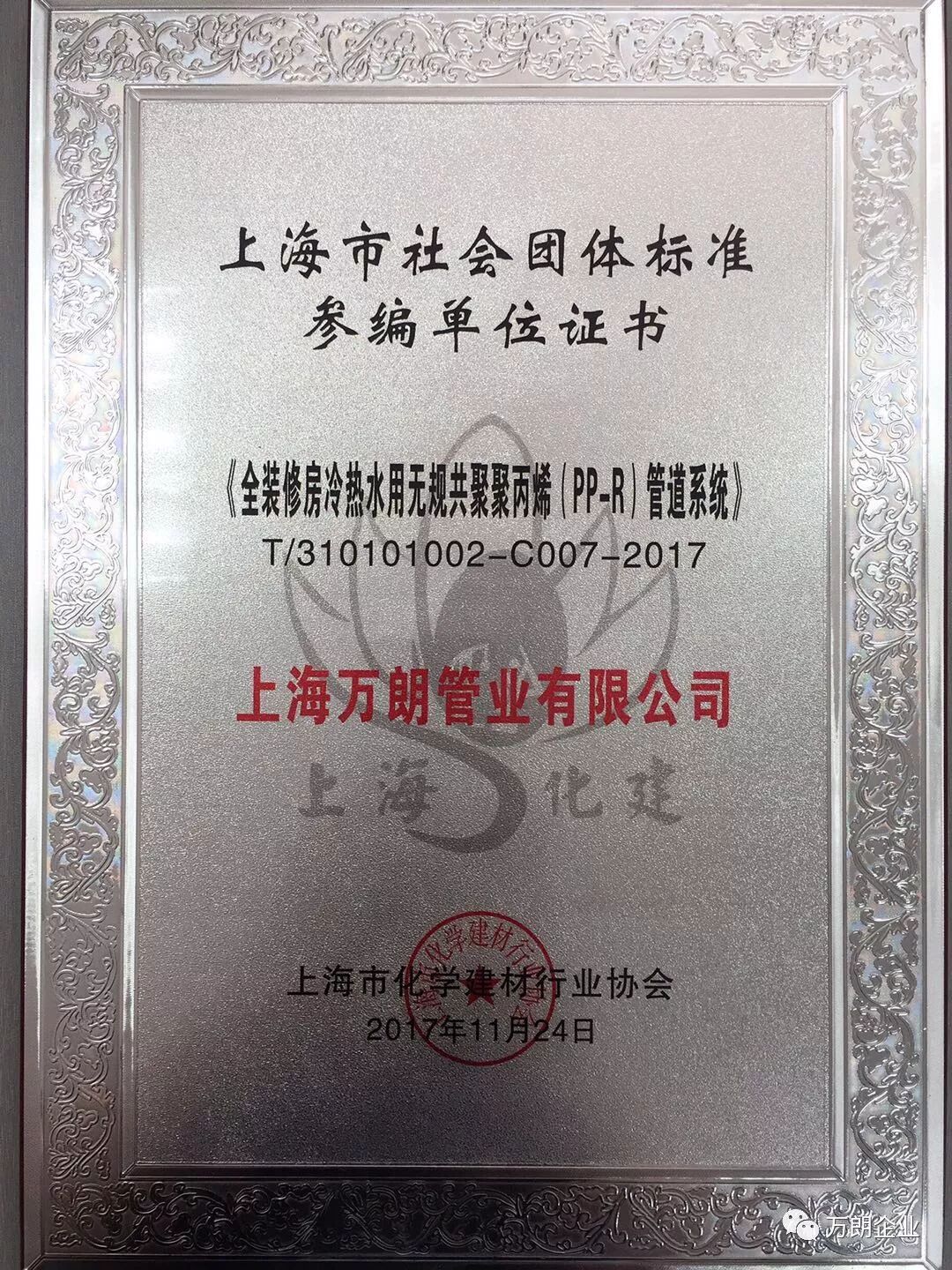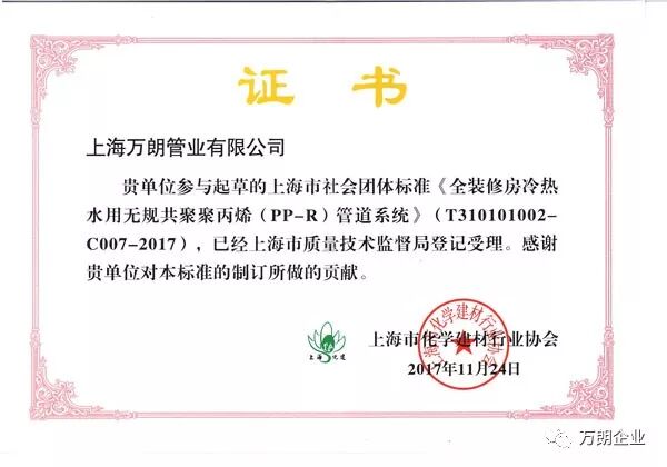 3月9日,由上海市化学建材行业协会塑料管道分会主办的上海市社会团体标准《全装修房冷热水用无规共聚聚丙烯(PP-R)管道系统》参编单位颁证仪式在上海逸春园酒店隆重举行,万朗作为主要起草单位应邀出席此次颁证仪式。