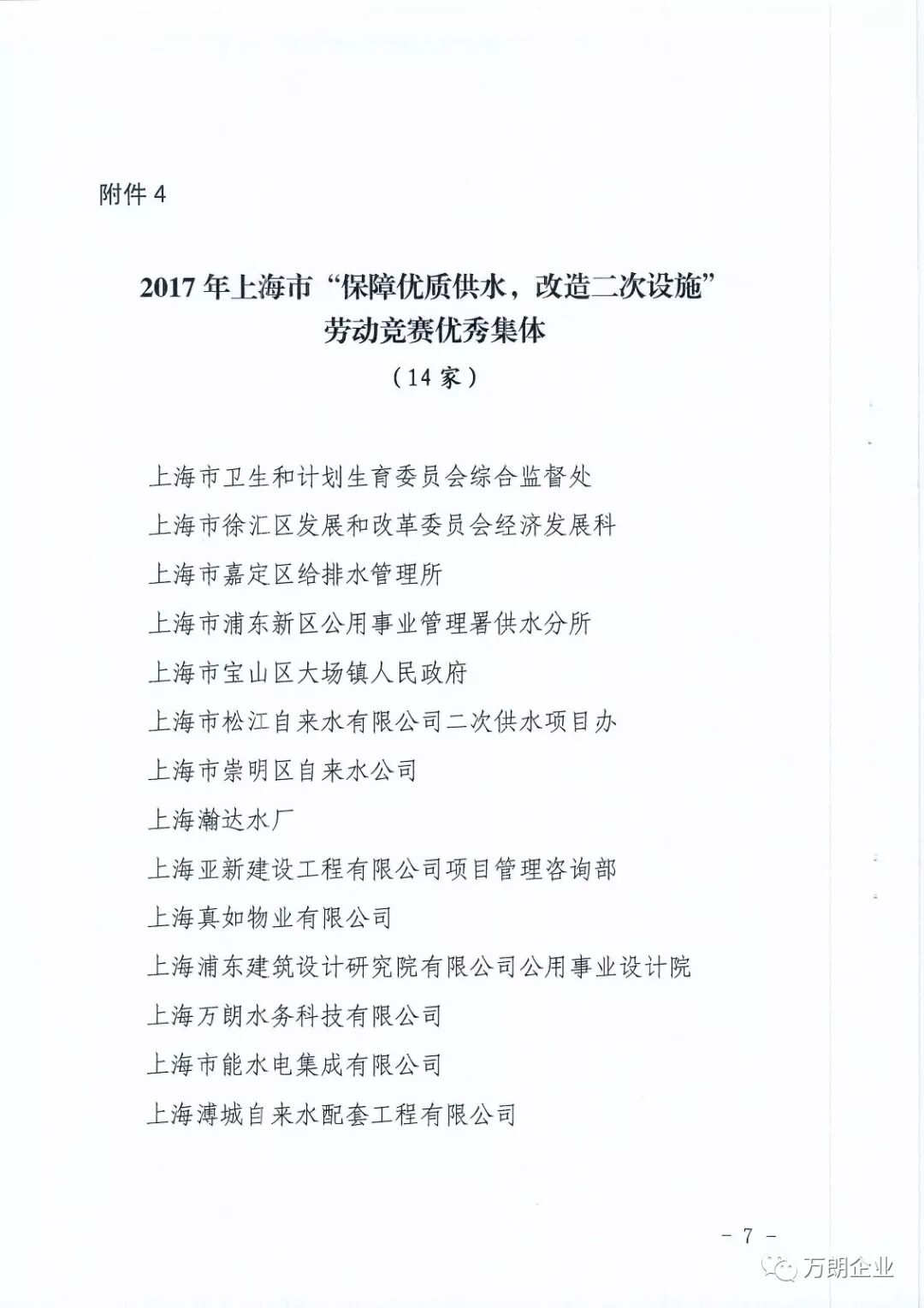 2018年5月,上海市水务局与上海市二次供水设施改造和理顺管理体制办公室对先进集体进行了表彰。上海万朗水务科技有限公司在评选中脱颕而出,荣膺“保障优质供水,改造二次设施”先进集体的光荣称号。