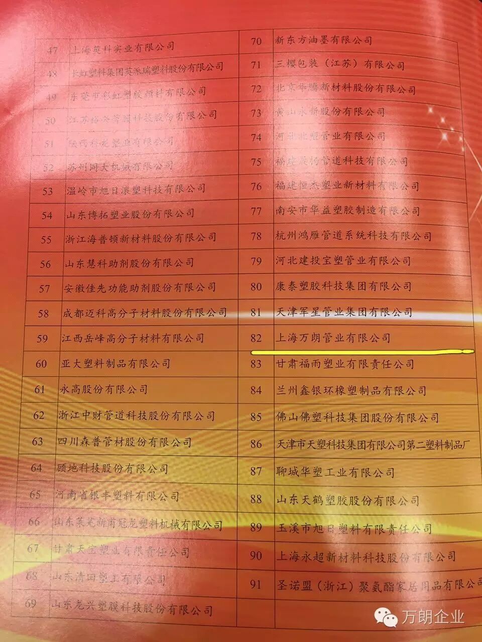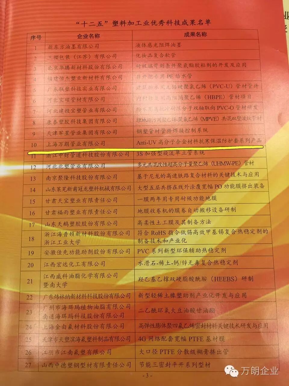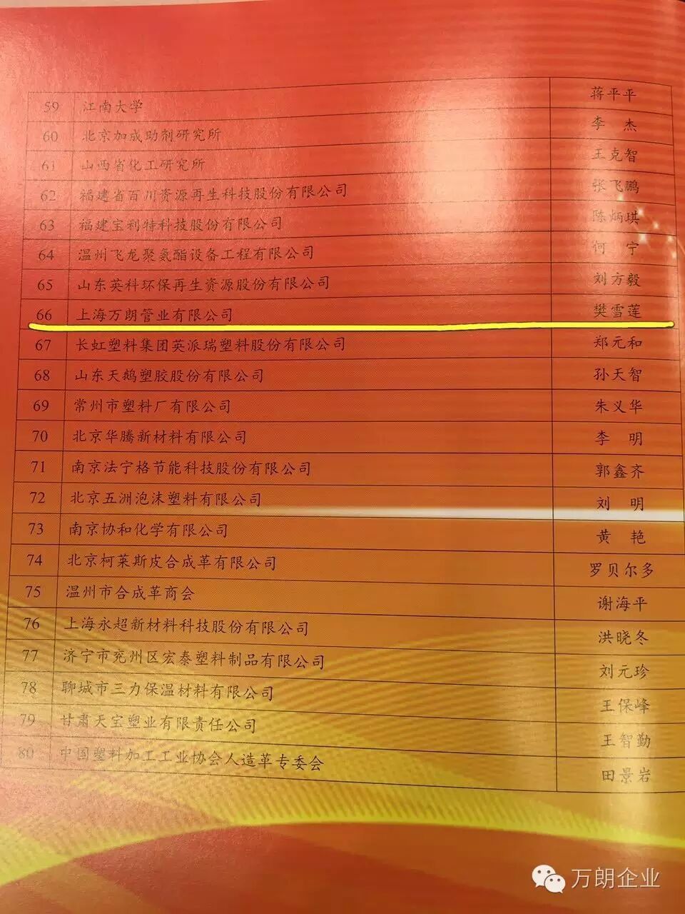 在2016年11月6日盛大召开的2016中国塑料加工工业协会年会上,上海万朗管业有限公司被评为“十二五”塑料加工业科技创新型企业,高分子合金材料抗寒保温套被评为“十二五”塑料加工工业优秀科技成果,万朗企业董事长樊雪莲被评为“十二五”中国塑料加工工业先进个人,同时受聘为中国塑料加工工业协会专家委员会供排水管道的专家。我们深知,这几大奖项的取得离不开行业主管单位领导、业界专家和同行的鼎力支持,离不开亲朋好友的倾情相助。我们将继续攻坚克难,不负重托,以更加饱满的精神状态和优质服务回馈行业,回馈社会,做一个讲良心、有担当、负责任的企业,为水务环境事业贡献更大的力量。